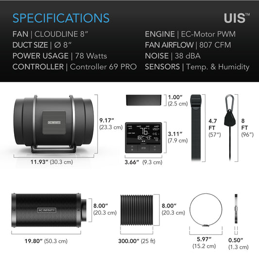 AIR FILTRATION KIT PRO 8", INLINE FAN WITH SMART CONTROLLER, CARBON FILTER & DUCTING COMBO