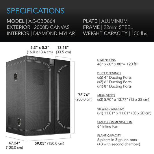 CLOUDLAB 816, ADVANCE GROW TENT 10X5, 2000D DIAMOND MYLAR CANVAS, 120" X 60" X 80"