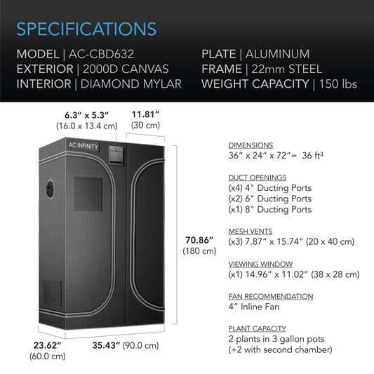 CLOUDLAB 632D, 2-IN-1 ADVANCE GROW TENT 3X2, 2000D MYLAR CANVAS, 36" X 24" X 72"
